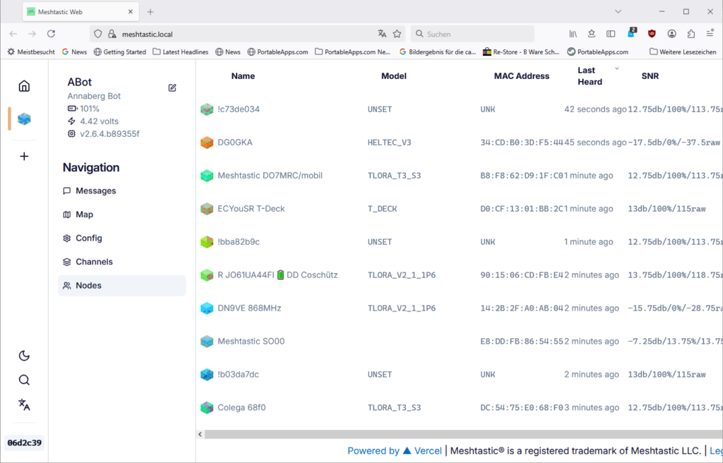 In der App für das Mobiltelefon kann man sich mit Bluetooth, Netzwerk (WLAN) oder seriell (USB-Kabel) mit dem Board verbinden. Gleiches gilt auch für den PC. Man ruft im Browser (Chrome oder Edge; Firefox kann nur WLAN) die Adresse https://client.meshtastic.org auf und klick auf „Neue Verbindung“. Will man Bluetooth nutzen, muss der PC oder Laptop entweder eingebautes Bluetooth oder einen Bluetooth-Dongle besitzen und im Board muss Bluetooth aktiviert sein. Für http muss im Board WLAN aktiviert sein. Der Browser muss entweder http-Verbindungen akzeptieren oder man nutzt https und klickt sich durch die Fehlermeldungen bis zur Freigabe der Verbindung. Ist das Board über ein USB-Kabel mit dem PC verbunden, kann man „Seriell“ nutzen. Man lässt nun sein Board suchen und verbindet sich. Die Web-Oberfläche ist ähnlich aufgebaut wie die App für das Mobiltelefon. Einfach durchklicken und alles anschauen.
